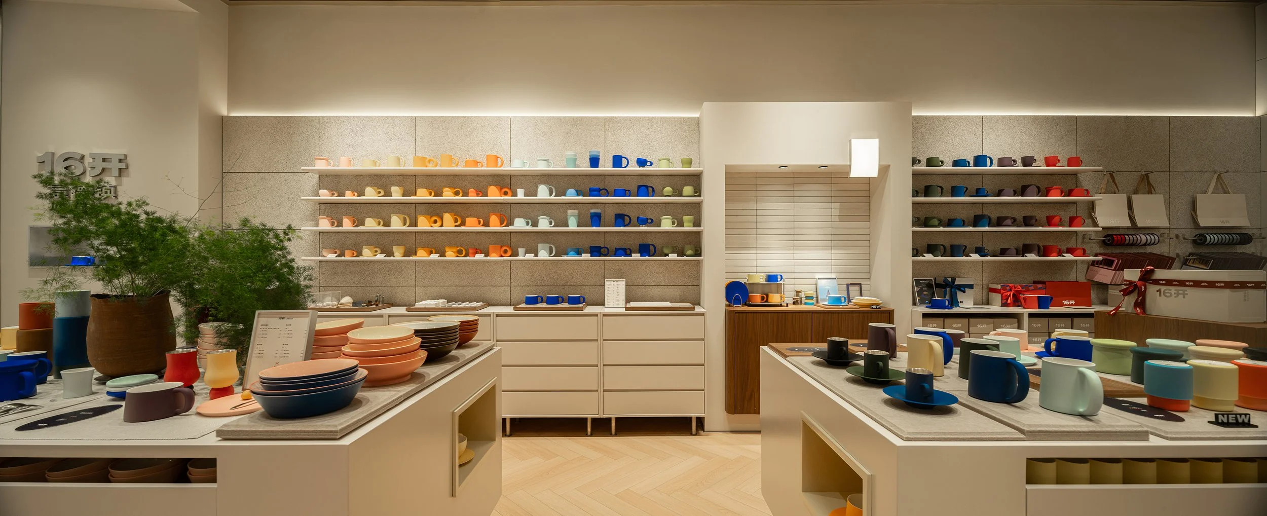 The material palette draws inspiration from the atmosphere of ceramic bisque emerging from the kiln. Off-white textured paint, rough wood-wool acoustic panels, and the brand’s own recycled ceramics collectively form a subdued and warm natural base. Upon this neutral and serene canvas, the eye-catching color system gradually unfolds. Additionally, the proportion of the Sixteen Utensil (16 Kai) paper size has been applied to the technical segmentation of wall materials, allowing the brand’s visual concept to extend into the space.